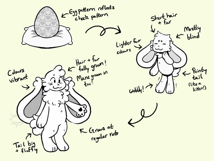 Unlike most mammals, flutterbunny babies hatch from unique coloured and patterned eggs about the size of a robin's egg. After roughly 40 days, the eggs hatch into smaller and much fluffier versions of what the adults look like. Although they mostly travel on all fours for the majority of their toddler years, most transition to becoming bipedal by the age of 8. It is around this time as well that their adult fur comes in and their markings become clearer.